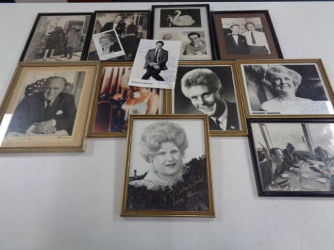 A box of framed and unframed autographed pictures to include Rowan Atkinson, Joe Brown, Margery Manners, Barbara Windsor etc