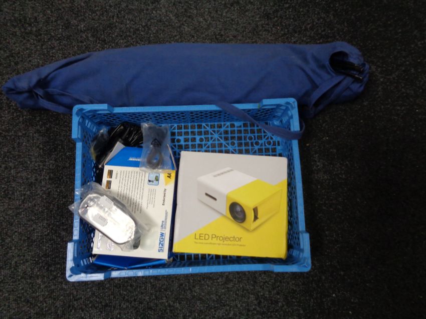 A Next Base dash-cam together with a LED projector and screen in carry bag