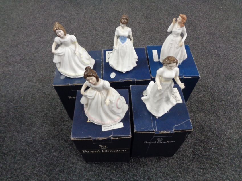 Five Royal Doulton boxed figures to include Sentiments Greetings HN4250, Joy HN3875, Amanda HN 3635 and two others.