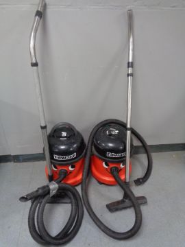 Two Edward 110V commercial vacuums with hoses and accessories.