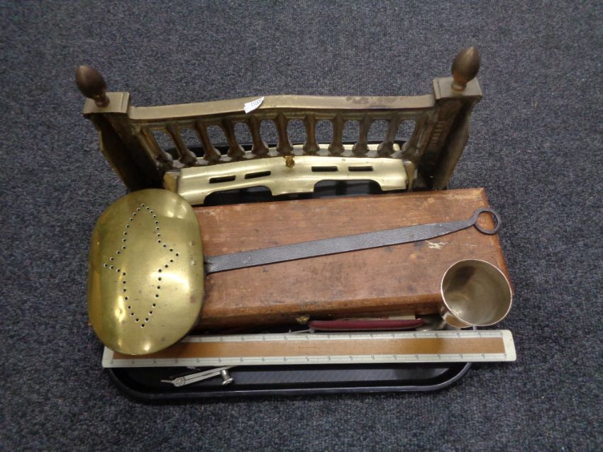 A brass fire front together with an antique brass cast iron handled chestnut roaster, cased printer set, drawing instruments etc.