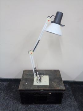 An antique metal deed box together with an angle poise lamp
