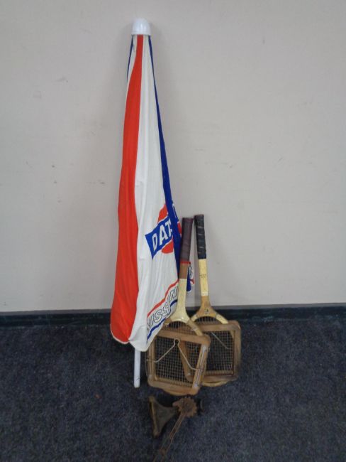 A Nissan Datsun parasol together with a vintage car bottle jack and two vintage tennis rackets