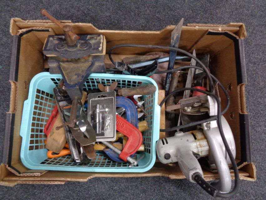 A box of assorted vintage hand tools, Stanley wood planes, G-clamps, vice etc