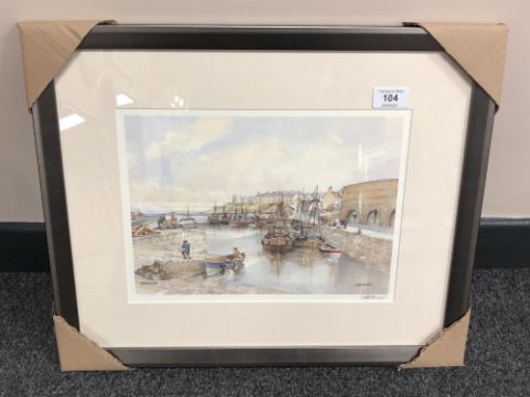 After Tom MacDonald : Seahouses, reproduction in colours, signed in pencil, 21 cm by 30 cm, framed.