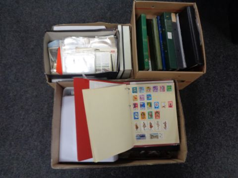Three boxes containing a large quantity of world stamps and first day covers in albums and folders.