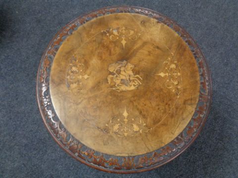 A Victorian inlaid mahogany and walnut pedestal occasional table on bun feet.