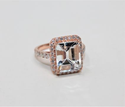 A 14ct rose gold aquamarine and diamond cluster ring, the pale blue emerald-cut aquamarine weighing 3.97 carats. the forty brilliant-cut diamonds having a total weight of 0.71 carat, size M. With certification.
