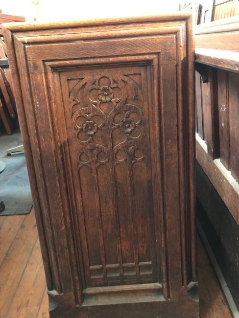 Two decorated end panels, pew in two parts with plain back. Sold with all faults.