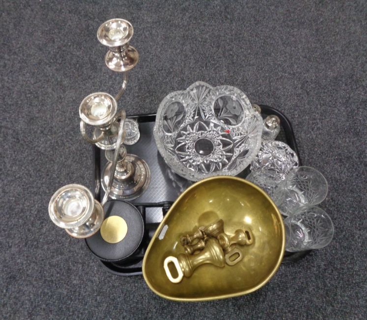 A tray of assorted glass, three way plated candelabra, kitchen scales with brass weights etc
