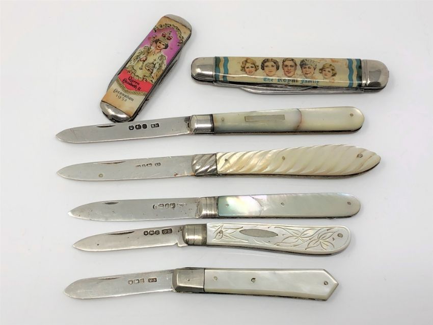 Five 20th century mother of pearl-handled fruit knives with silver blades and two Royal commemorative pocket knives. (7)