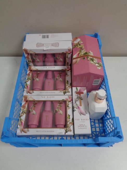 A box containing beauty products to include Ted Baker Pretty Little Blossom gift sets, bath and shower oils, body lotion.