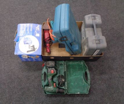 A box of power tools, Hitachi router, Bosch drill, Black and Decker sander etc