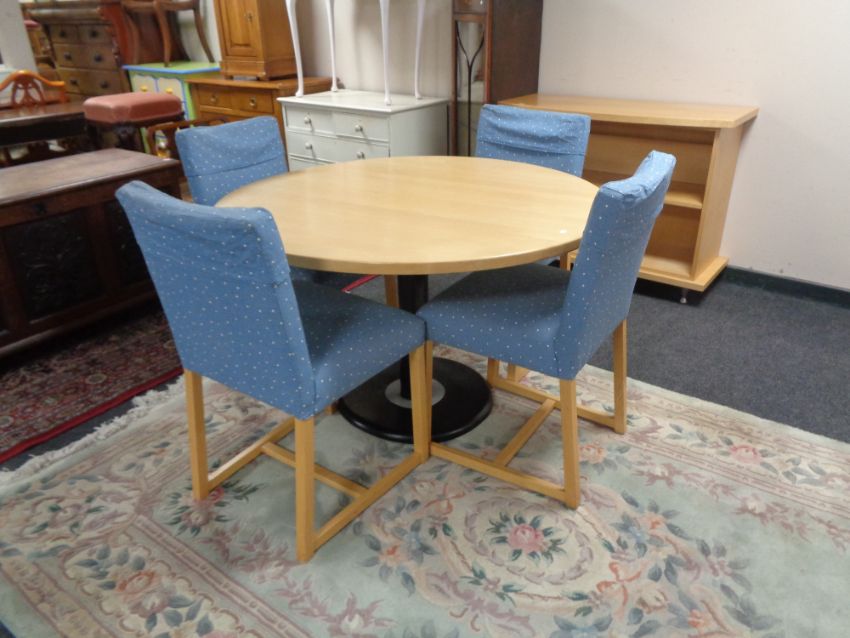 A circular pine topped table on a metal pedestal together with a set of four dining chairs upholstered in a blue spotted fabric on pine legs.