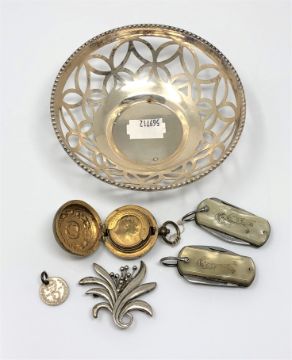 A brass sovereign case, a silver brooch, a silver plated pierced bowl, a thrupenny bit and two pocket knives. (6)