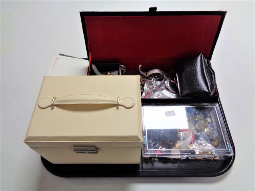 A tray containing postcards, buttons, leather jewellery box, costume jewellery etc.
