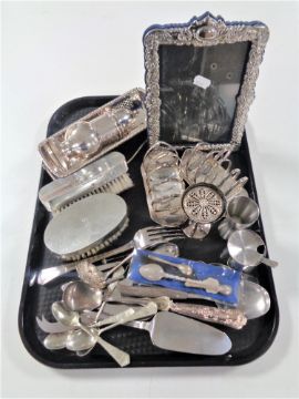 A tray containing antique and later plated wares to include photo frame, toast rack, sugar sifter, cutlery, pewter backed clothes brushes.