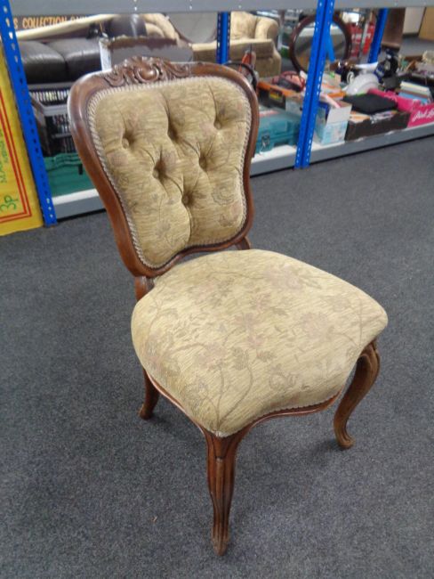 A beech framed French occasional chair upholstered in floral fabric on cabriole legs