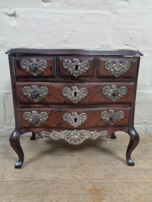 A 19th century rosewood jewellery box in the form of a six drawer chest on cabriole legs with white metal mounts.