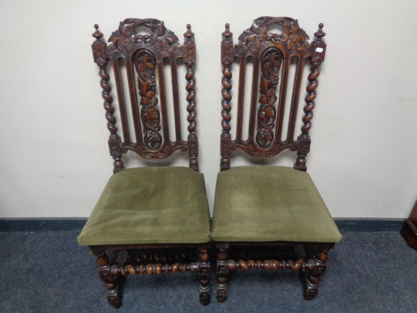 A pair of Edwardian heavily carved oak dining chairs