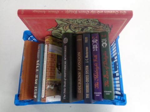 A box containing nine Folio Society volumes to include Bill Bryson, John Mansfield, Kingsley Amis.