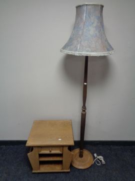 A beech standard lamp with shade together with a magazine occasional table fitted a drawer