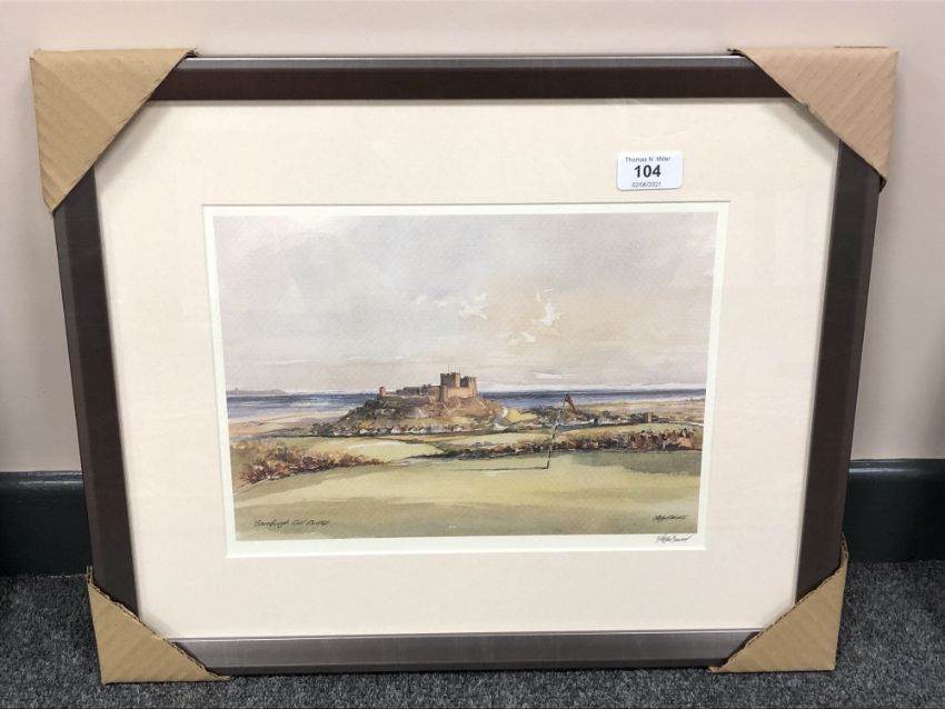 After Tom MacDonald : Bamburgh Golf Course, reproduction in colours, signed in pencil, 21 cm by 30 cm, framed.