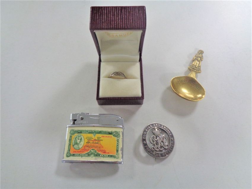 A brass caddy spoon together with Dragon lighter, military service badge.