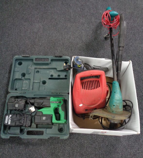 A cased Hitachi 24 volt drill together with a further box containing Power Devil pressure washer, garden strimmer, Xtreme drill etc.