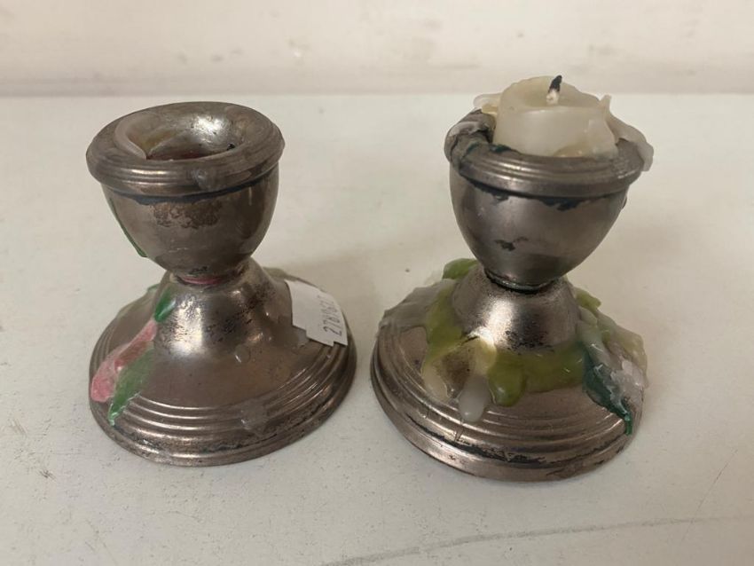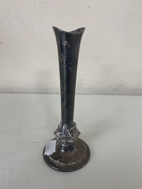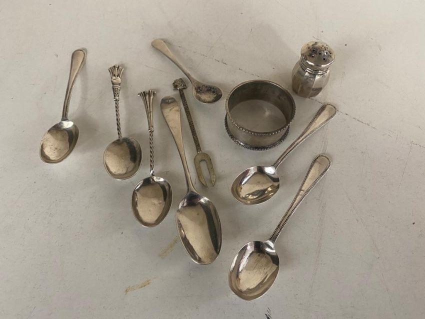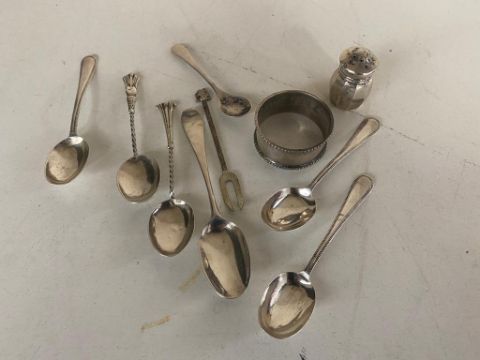 A small collection of silver items to include - posie vase, two pairs of squatt candlesticks, napkin ring, pepperette and eight pieces of cutlery.