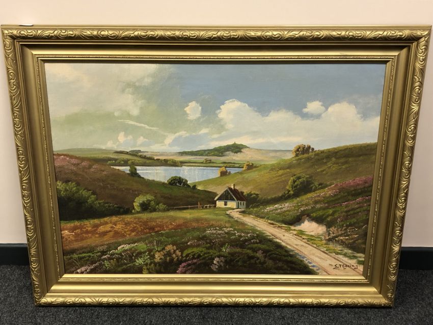 Continental school : A cottage in a landscape, oil on canvas, 94 x 66 cm, framed.