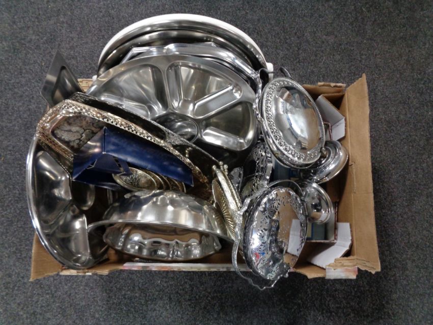 A box containing stainless steel serving trays, bowls etc, together with a box containing table cutlery.
