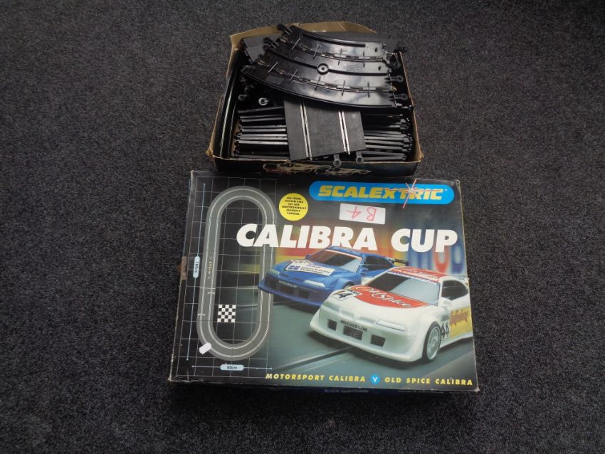 Two boxes containing Scalextric track together with a further box containing vintage and later board games.