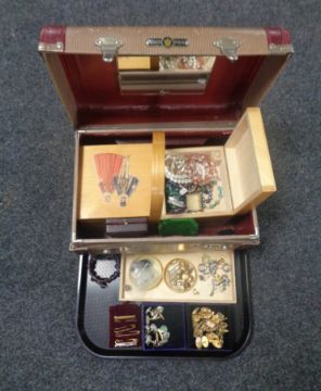A tray containing vanity case and concertina jewellery box containing large quantity of assorted costume jewellery, tie pins, cuff links etc.