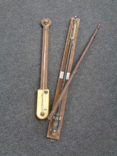 A Standard Condition thermometer mounted on a board together with one other and a stick barometer (a/f).