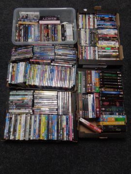 Five boxes containing assorted DVDs to include box sets, Sex and the City, King of the Hill etc.