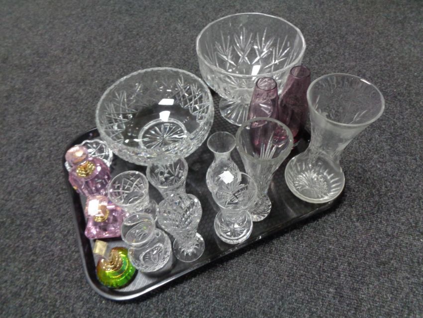 A tray containing assorted glassware to include cut glass and lead crystal vases, fruit bowl comports together with three coloured glass perfume bottles.