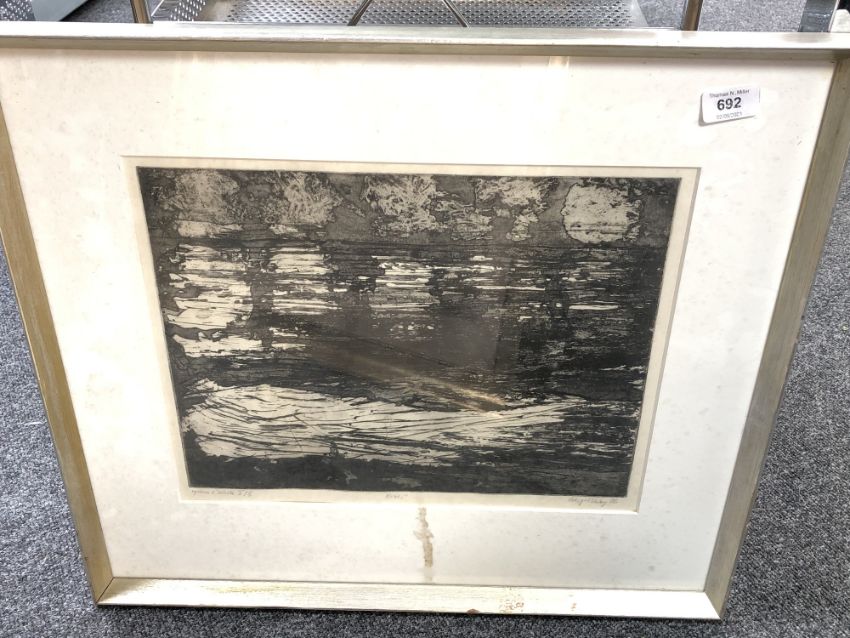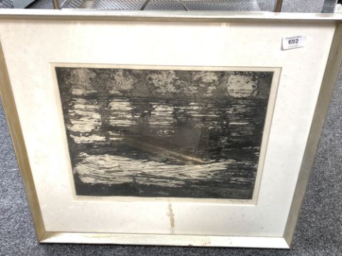 Twentieth century school : River, drypoint etching, indistinctly signed, 41 cm x 32 cm, framed.