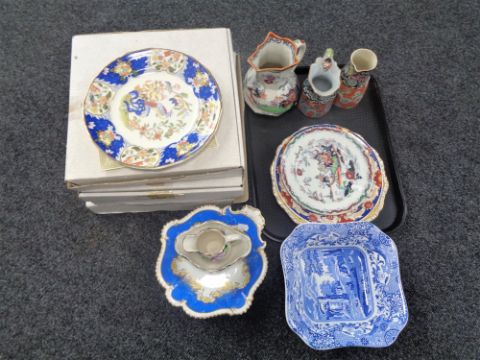 Four boxed Masons Ironstone Heritage collectors plates together with a tray containing antique and later china to include ironstone plate and jug, Spode Italian bowl etc.