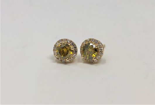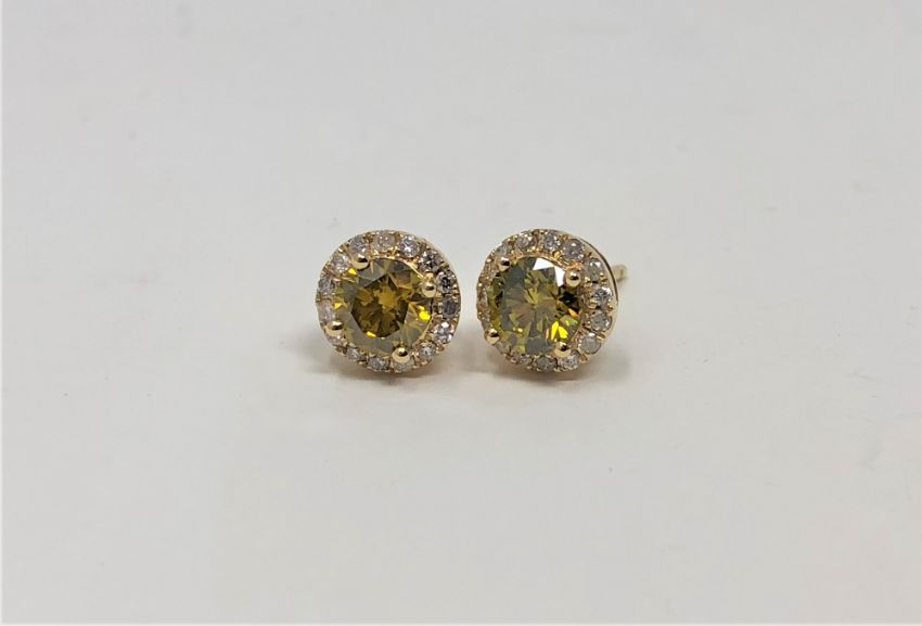 A pair of 14ct gold yellow diamond stud earrings, the principal stones having a combined weight of 1.34 carat. With certification.