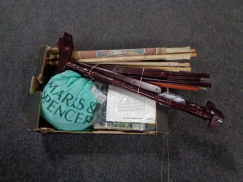 A box containing vintage knitting patterns, tapestry stand and frame, tapestries.