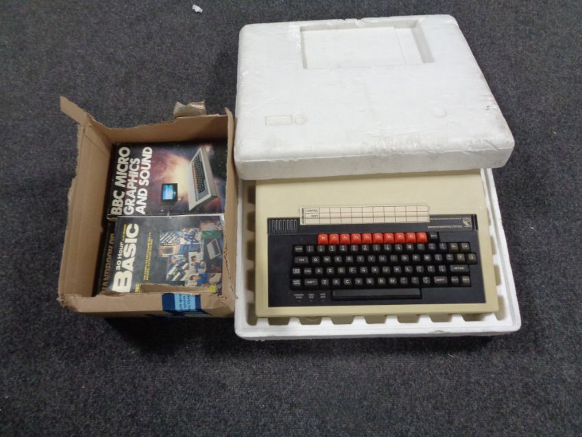 An Acorn BBC micro computer system in original polystyrene packaging together with a box containing BBC graphics, sound and programming handbooks.