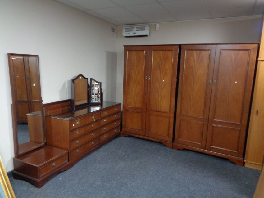 A late twentieth century Olympus 5 piece bedroom suite comprising of pair of double wardrobes, eight drawer chest, cheval mirror and headboard, together with a similar triple dressing table mirror