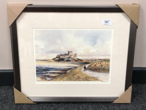 After Tom MacDonald : Bamburgh Castle, reproduction in colours, signed in pencil, 21 cm by 30 cm, framed.
