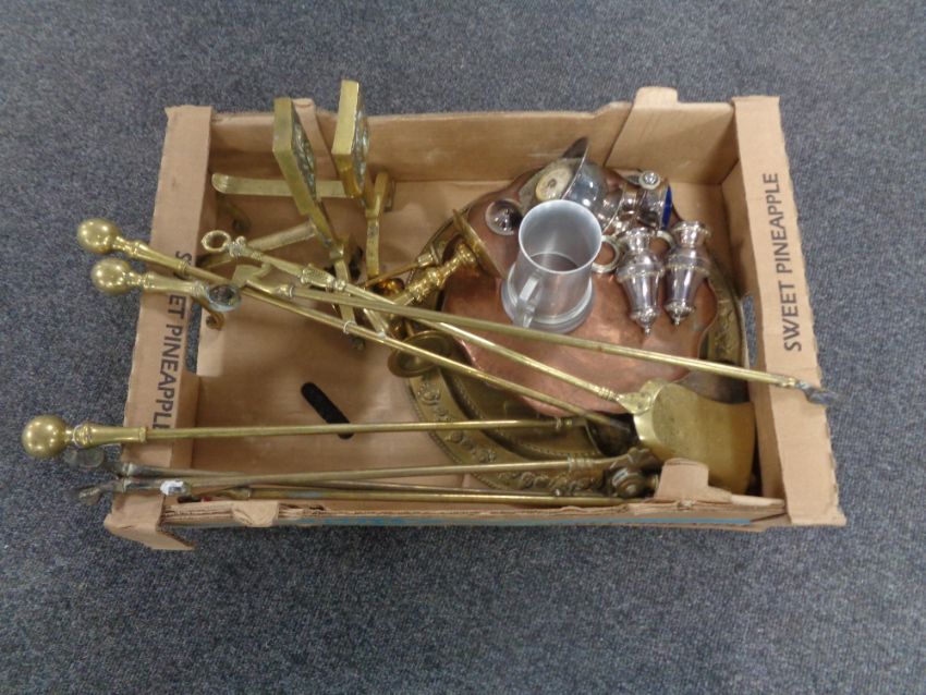 A box containing late 19th century brass companion pieces, fire dogs, copper tray, plated wares etc.