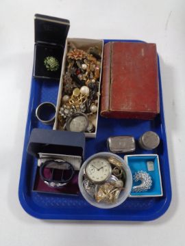 A tray of assorted costume jewellery, wristwatches, Ingersol pocket watch, plated napkin ring etc