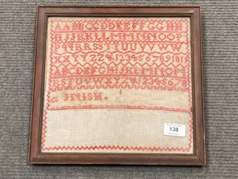 A Late 19'th Century sampler, 26 cm x 26 cm, with interesting hand-written note taped verso, framed.