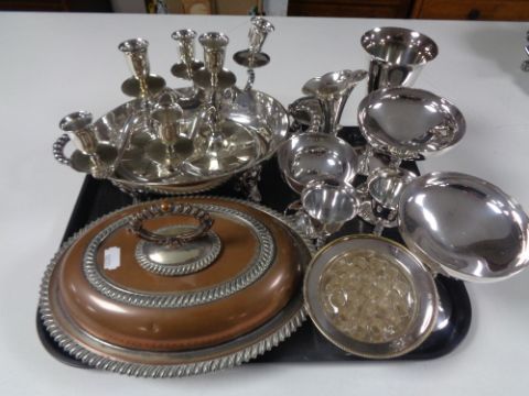 A tray containing plated wares to include terrenes, pair of three way candlesticks, goblets etc.