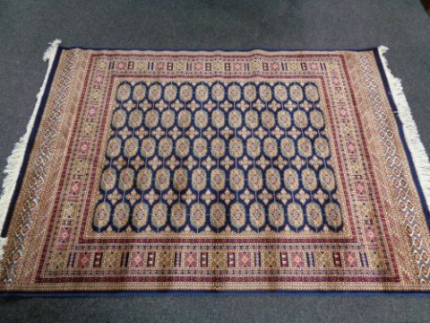 A Tekke design fringed rug on blue ground.