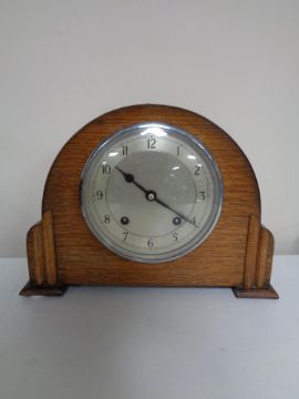 A 1930s oak cased Garrard mantel clock with silvered dial, pendulum and key.